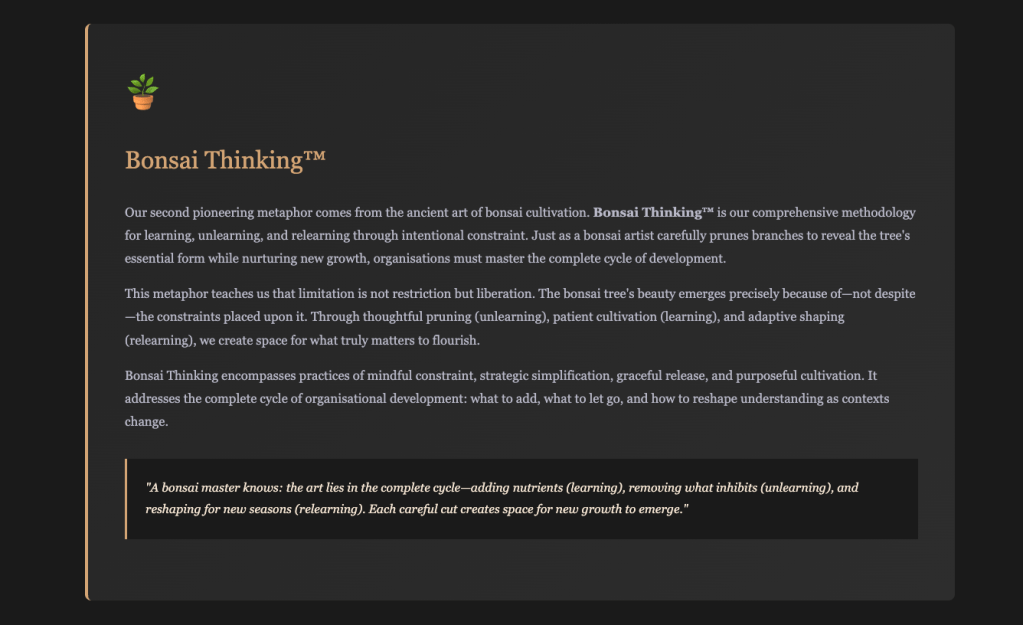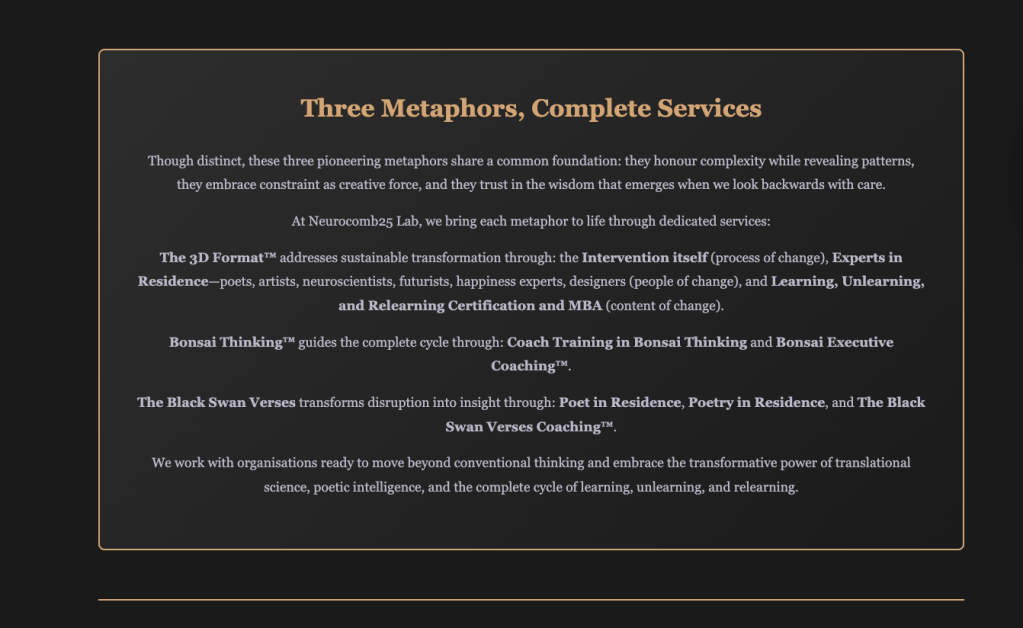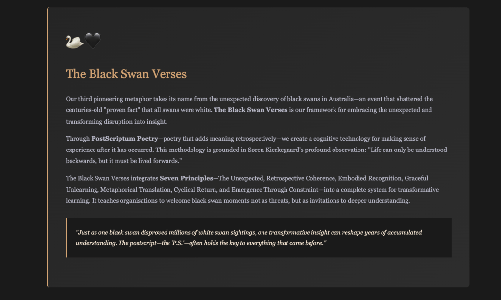 The Black Swan Verses™ emerged from Aleksandra’s recognition that the most profound insights never arrive during experience itself, but retrospectively—in the reflection that follows. PostScriptum Poetry™, with its unique structure of poem body exploring lived experience followed by the P.S. (postscript) delivering retrospective insight, mirrors the actual architecture of breakthrough learning. Like the discovery of black swans in 1697 that shattered the certainty “all swans were white,” this methodology challenges the invisible assumptions executives and organisations mistake for immutable fact. It creates cognitive zero—a position without value from which entirely new patterns can emerge, much as the invention of zero revolutionised mathematics by creating space where none existed before.