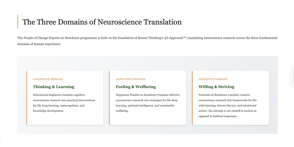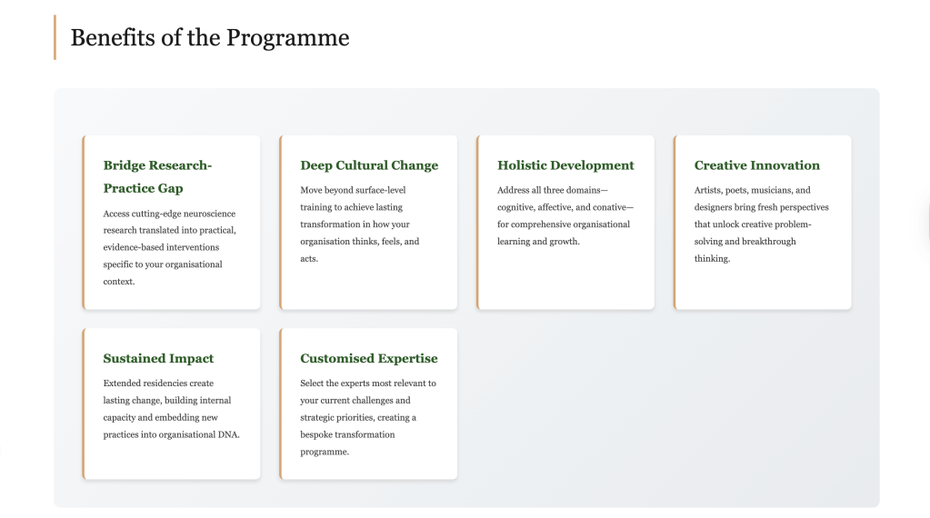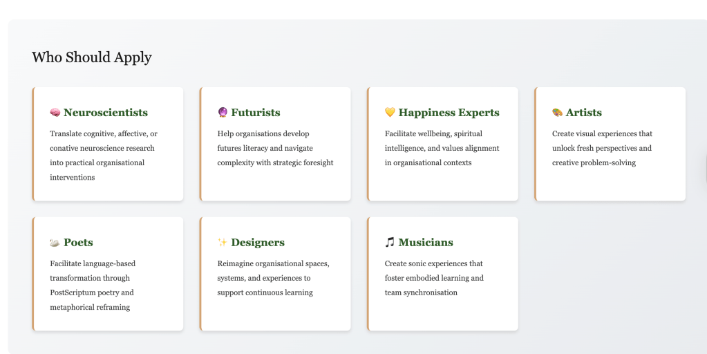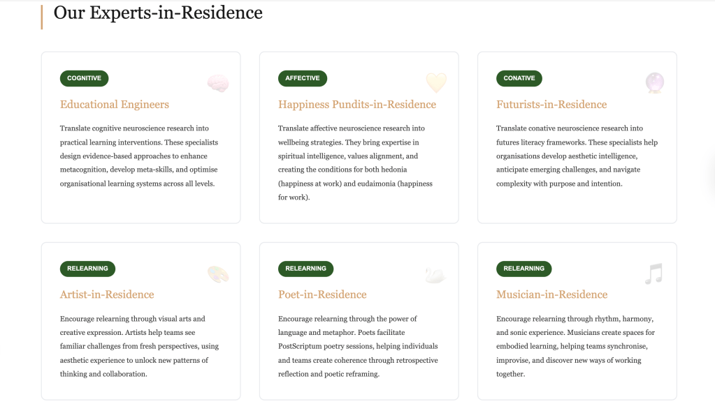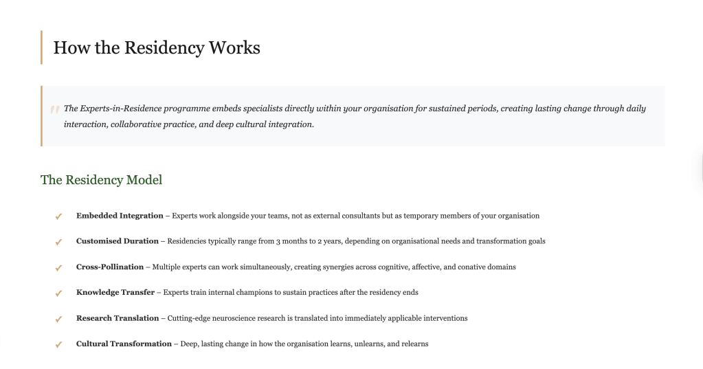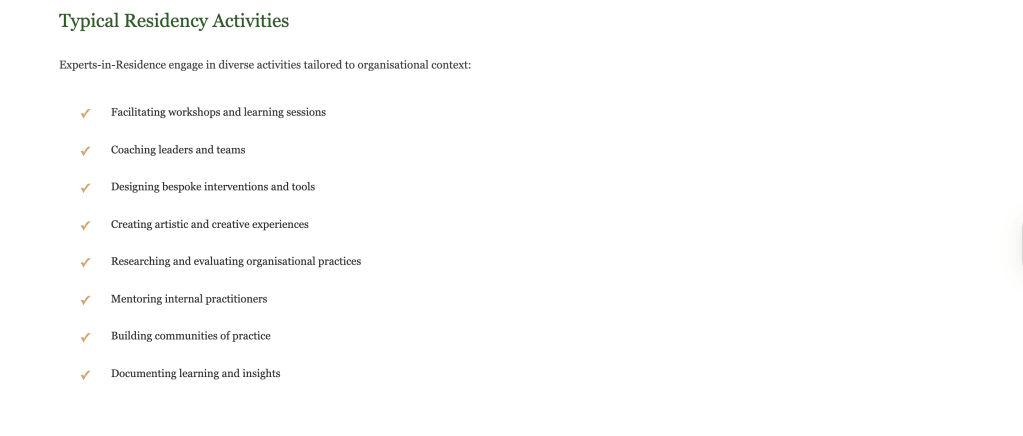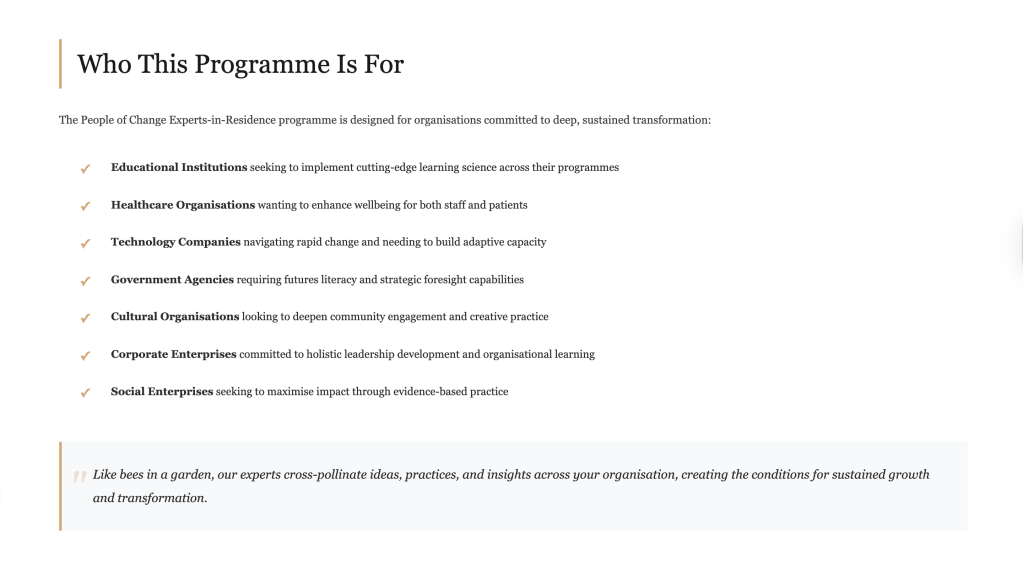 Experts embed within organisations like bees pollinating a garden—translating cutting-edge knowledge into transformative practice through six unique residency roles.